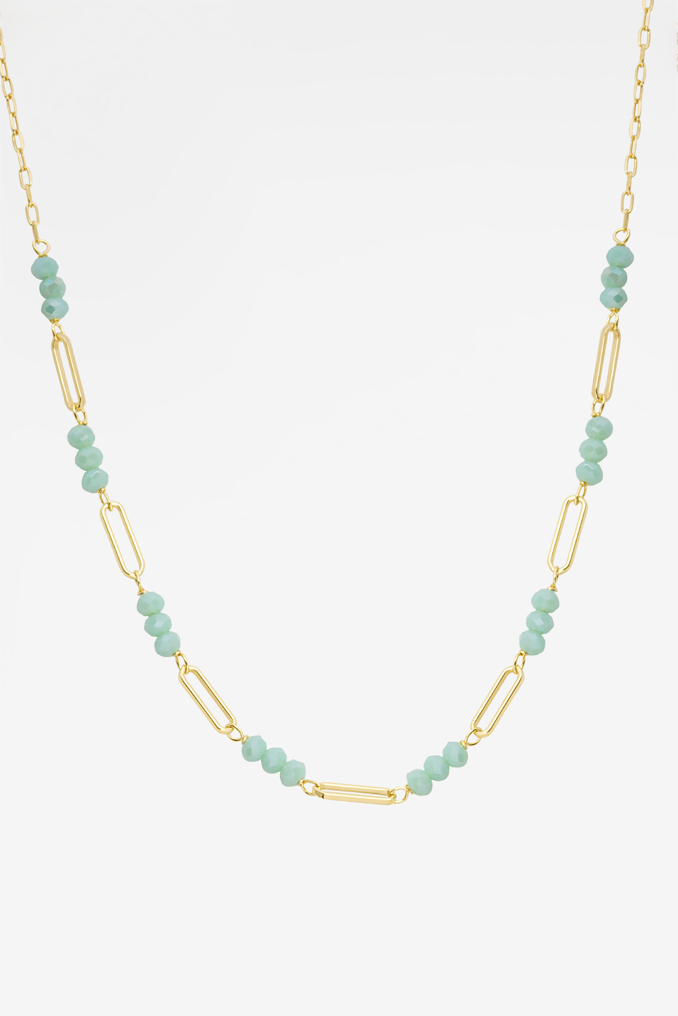 This beautiful styled necklace is a unique design and stands out with a beautiful 18k gold plated finish featuring beautiful Jade green colored beads for that extra attention to detail. It can be worn on its own or layered with other pieces of jewelry.