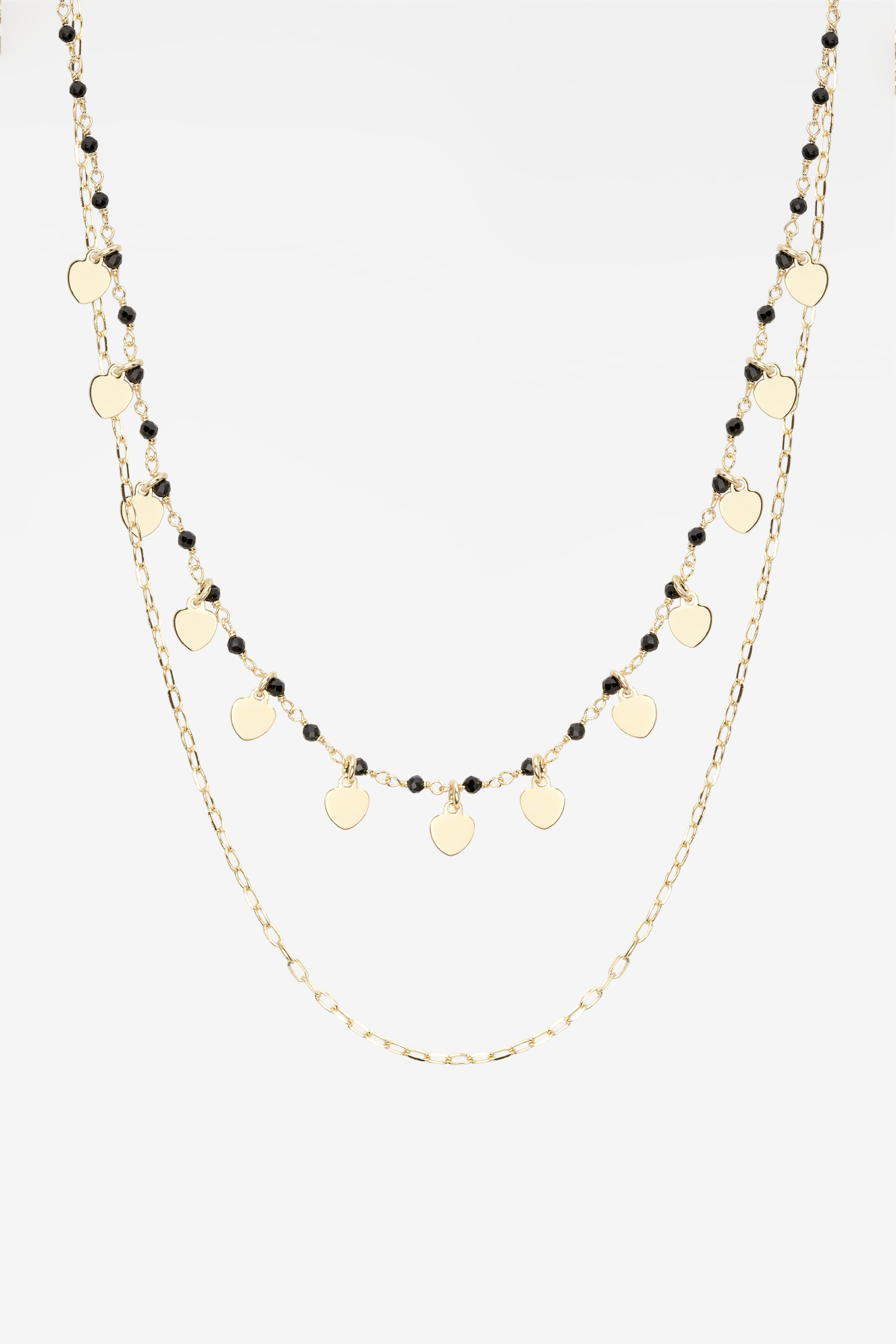 This beautiful twin chain styled necklace is a unique design and stands out with a beautiful 18k gold plated finish and black beads for that extra attention to detail. It can be worn on its own or layered with other pieces of jewelry.