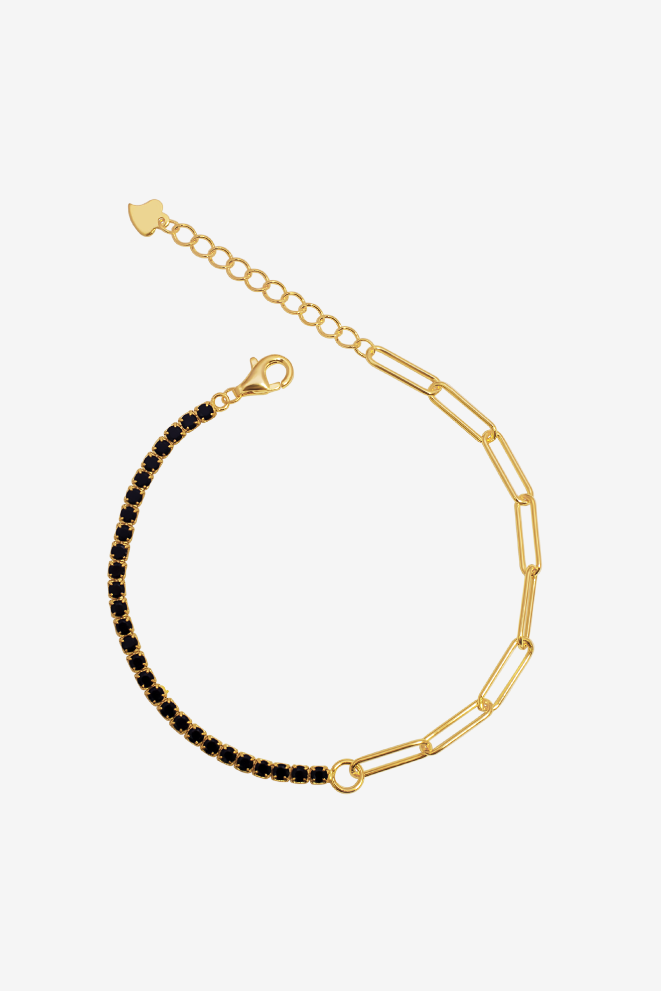 A tennis chain with a twist! Half tennis and half shackles bracelet design is a beautiful edition to any jewelry box. This eye catching item is beautifully plated in 18 karat gold 925 sterling silver and can be worn on its own or layered with other pieces of jewelry.