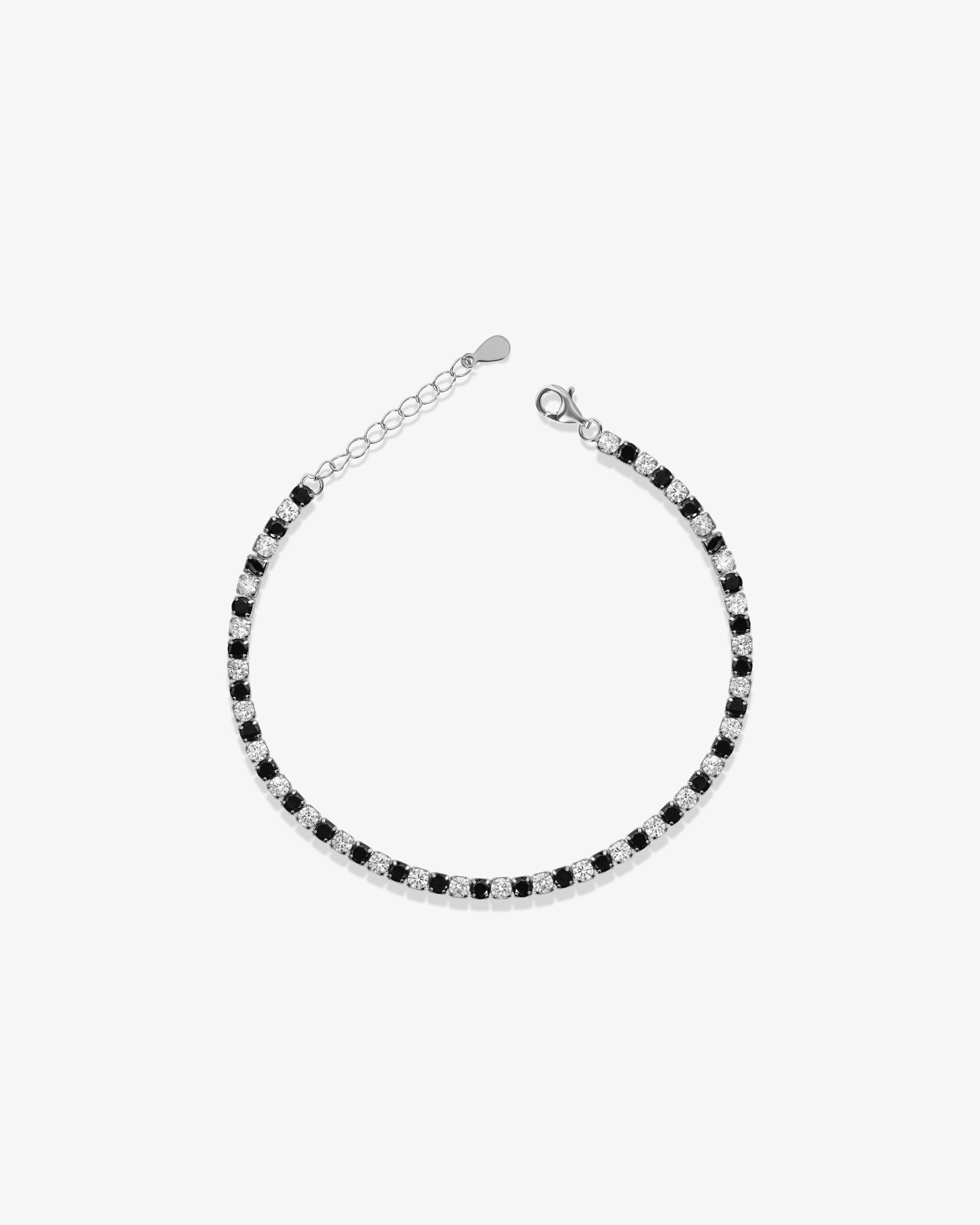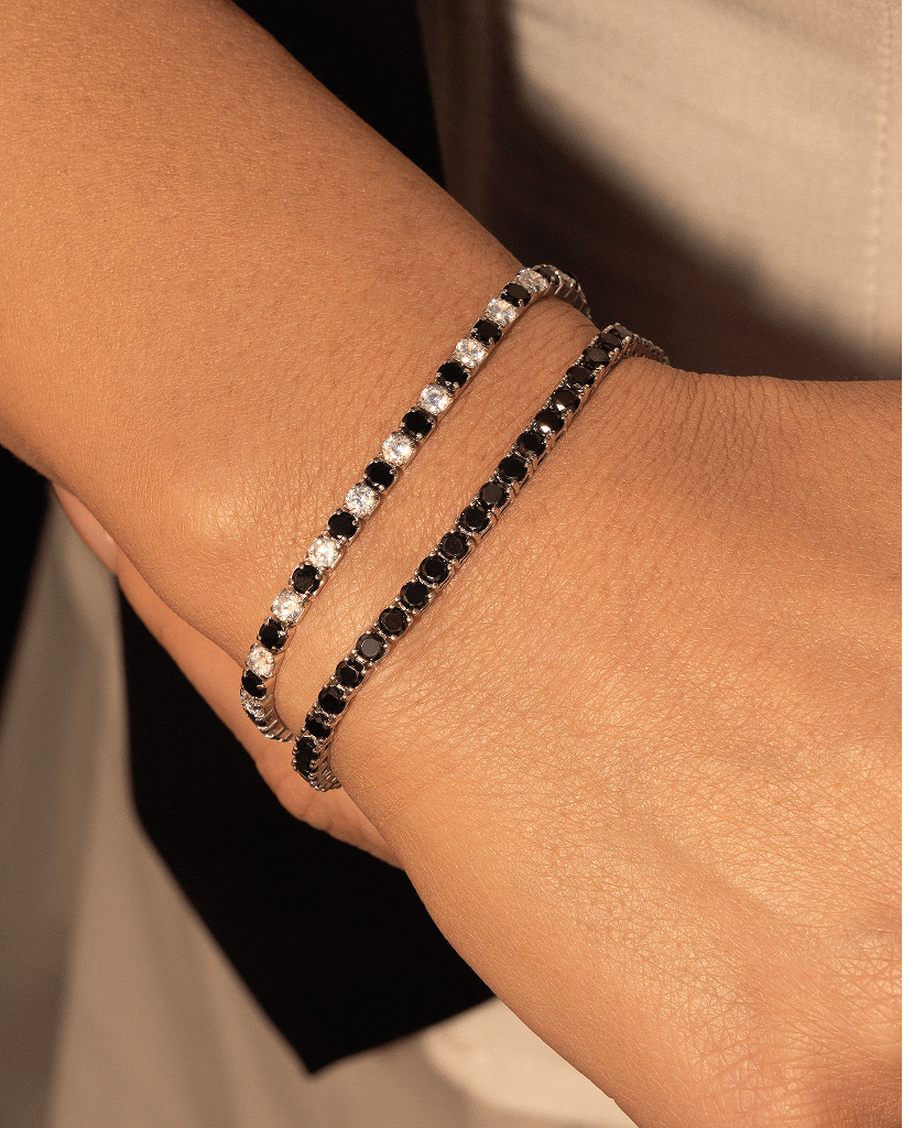A tennis chain is your jewelry boxes must have item! this eye catching classic is made from pure 925 sterling silver and can be worn on its own or layered with other pieces of jewelry. Made from beautiful white and black zirconia gems to give off that beautiful shine effect we all crave for.