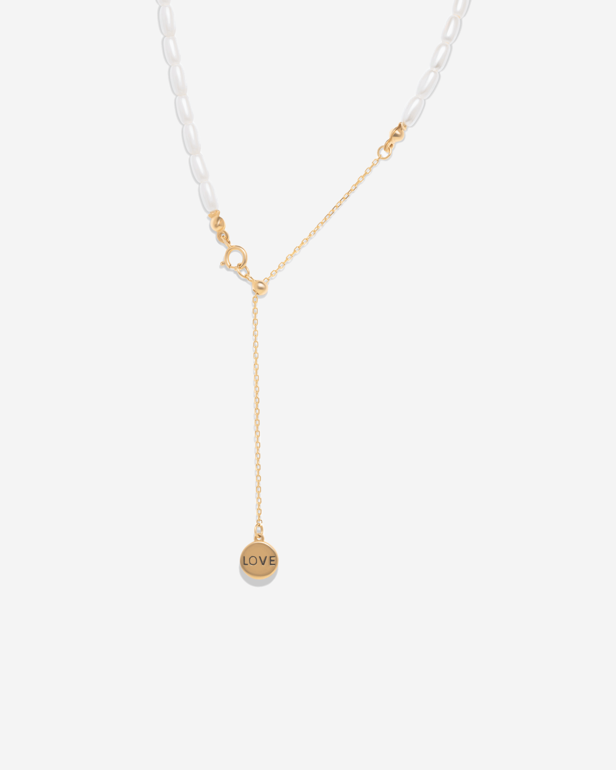 This beautiful pearl necklace is a must-have for your jewelry collection. Natural white lake pearls perfectly pierced into the most classic pearl necklace you could have, with beautiful 18 karat gold plated chain in the center.