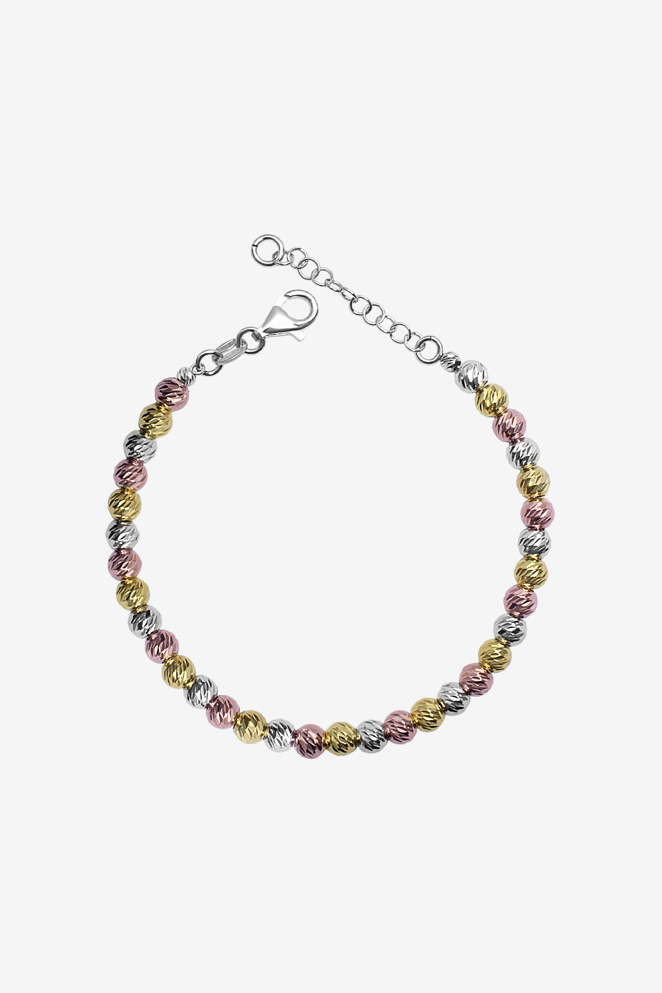 Disco balls are making a comeback and we got you. This beautiful bracelet features mini carved balls in 3 colors; 18k gold plated, sterling silver and rose gold. This funky yet chunky bracelet is perfect to be worn on its own or layered with other parts of jewelry.