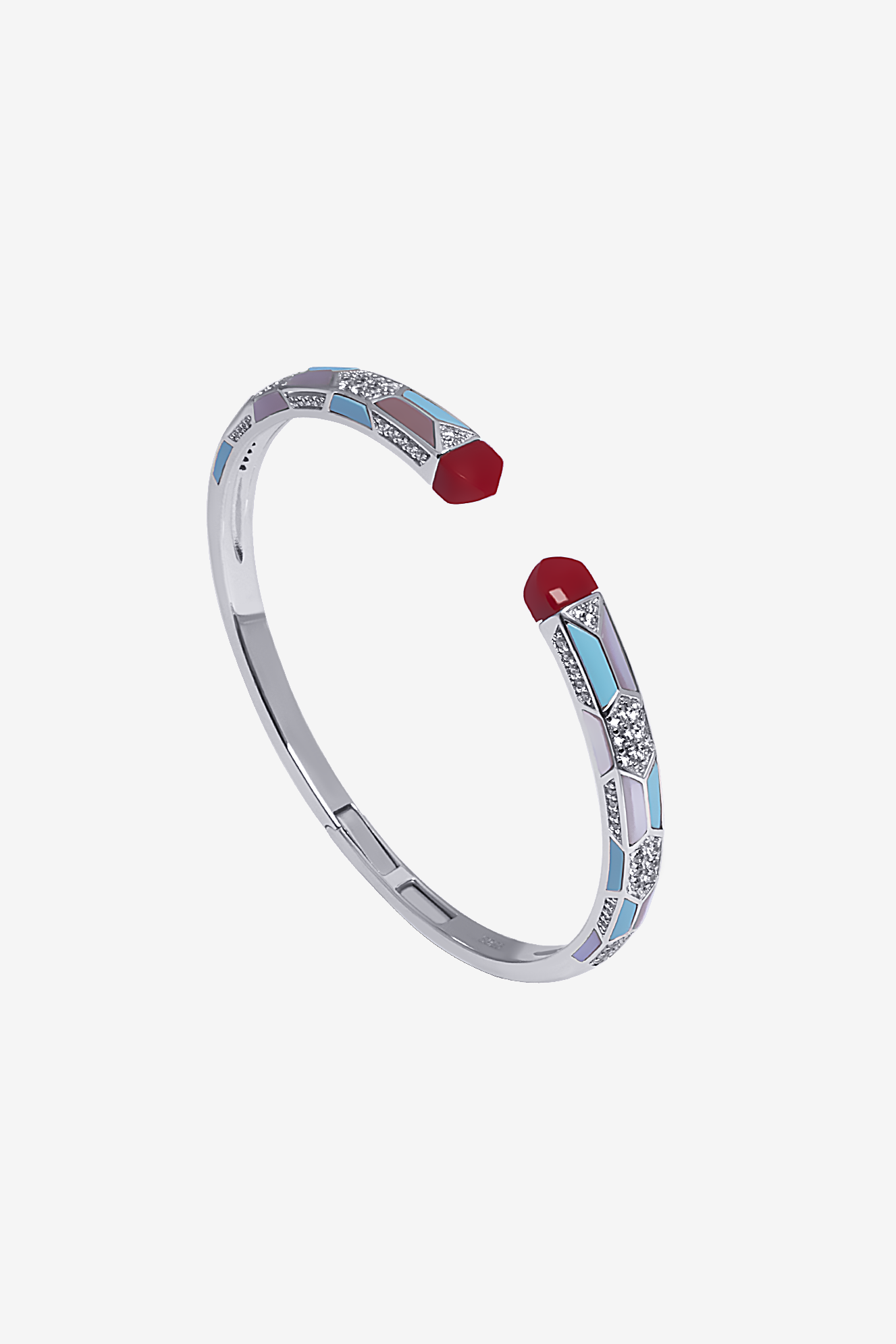 The Commit spiral bracelet is a stunning 925 sterling silver clip bracelet featuring beautiful attention to detail and a one of a kind timeless piece of beautiful jewelry with beautiful turquoise gems and zirconia gems.