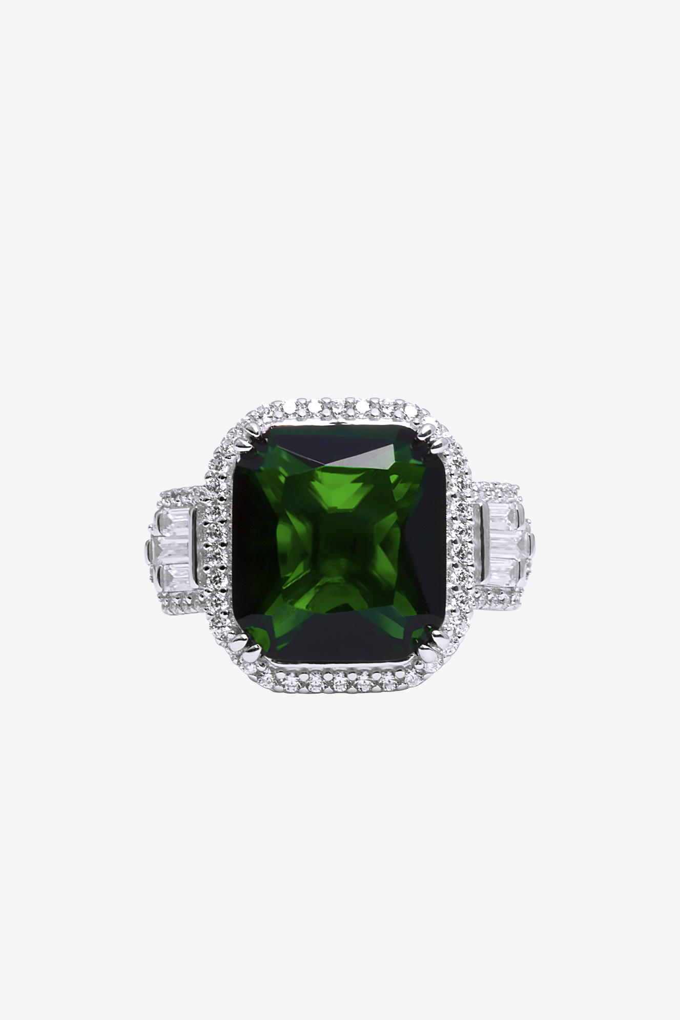 A bold ring is always needed. This beautiful ring features a Green Quartz gem with white zirconia gems studded on the top half of the ring. This magnificent piece stands out and makes a statement.