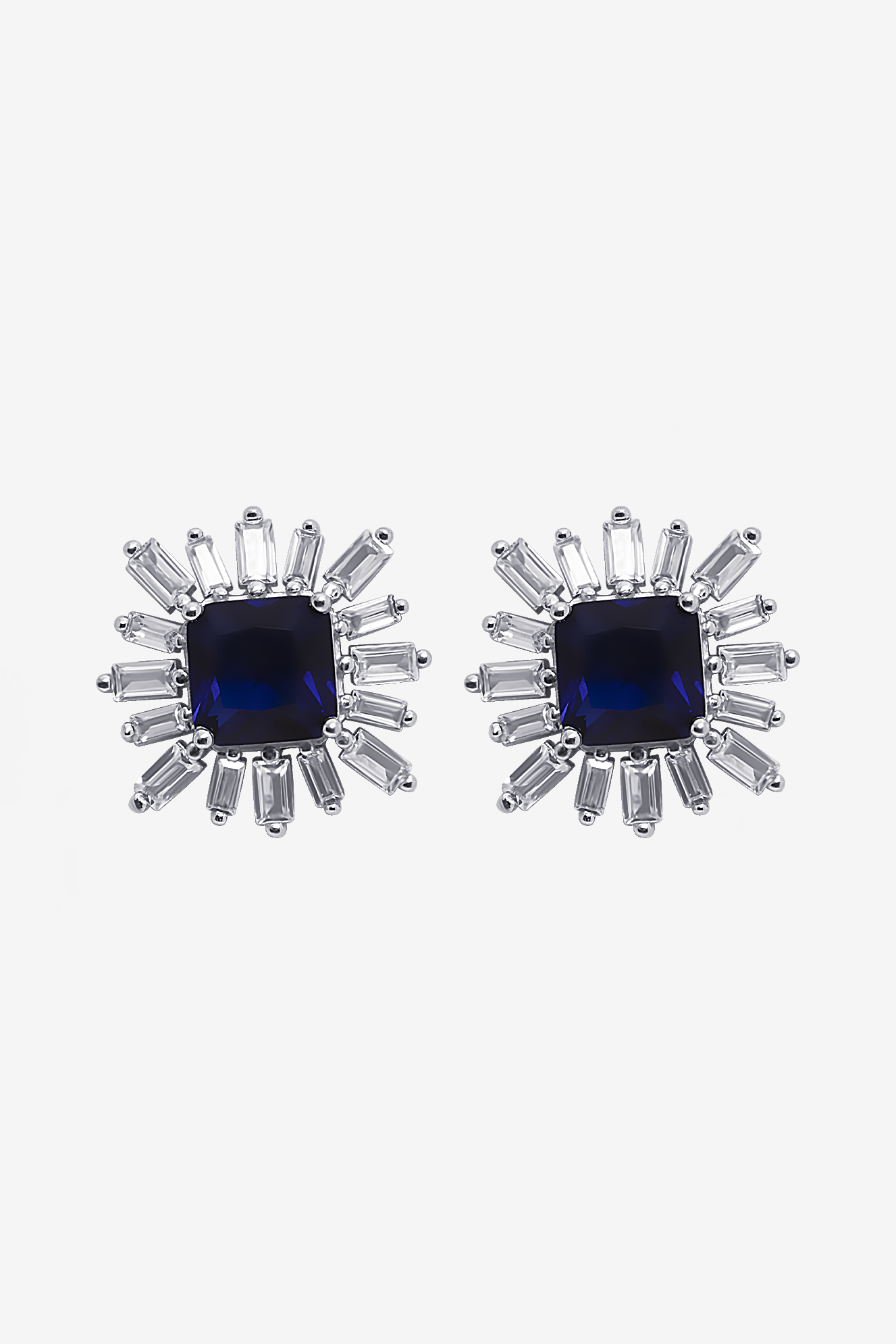 Big stud earrings just had a revamp at Roche Bianca. These beautiful earrings imitate a beautiful frozen flower with sapphire blue colored gems made from blue quartz with white zirconia gems cut in a baguette style shaped for the petals for that extra attention to detail.