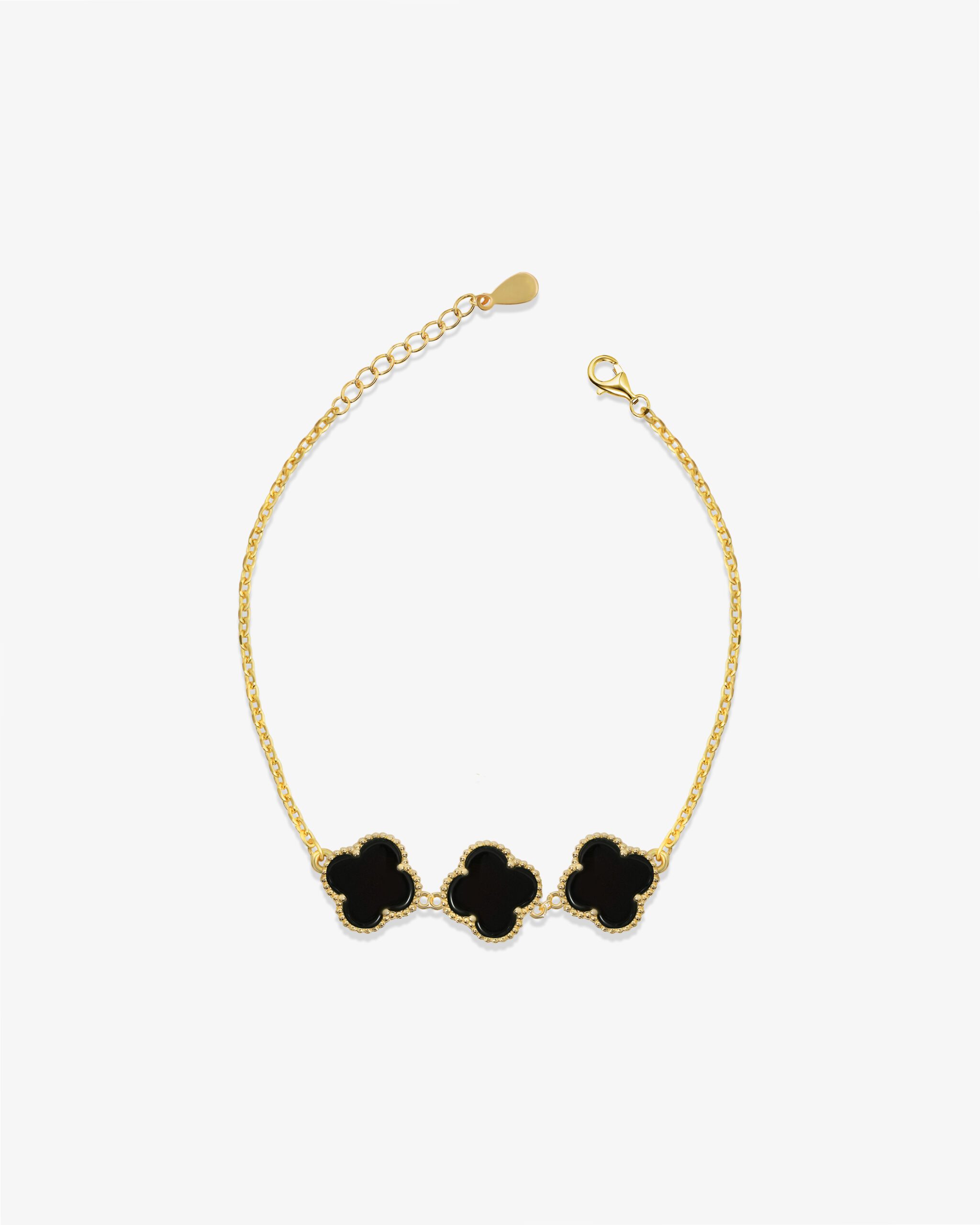 A sleek gold plated bracelet featuring three glossy black clover charms, each framed with delicate gold detailing. minimal, chic, and easy to pair with any outfit.
