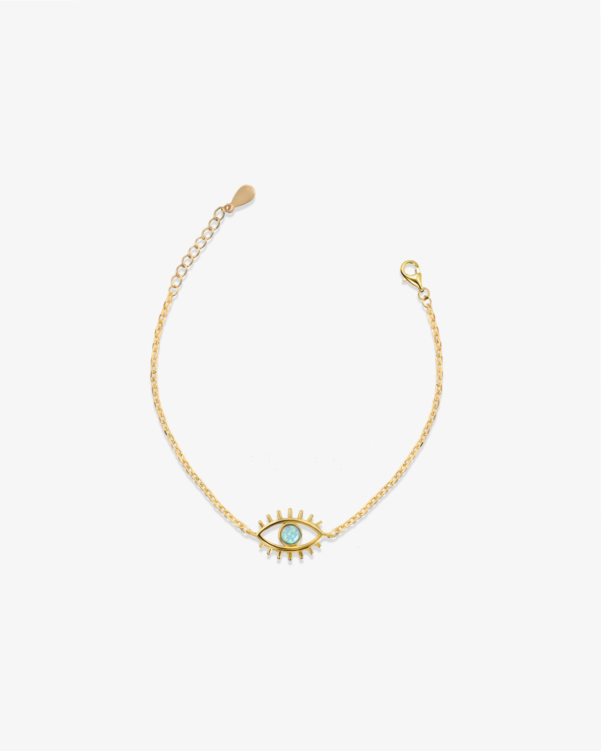 This delicate gold plated silver bracelet features a minimalist chain paired with a striking evil eye charm at its center. The charm showcases a bright blue detail symbolizing protection, positivity, and good fortune.