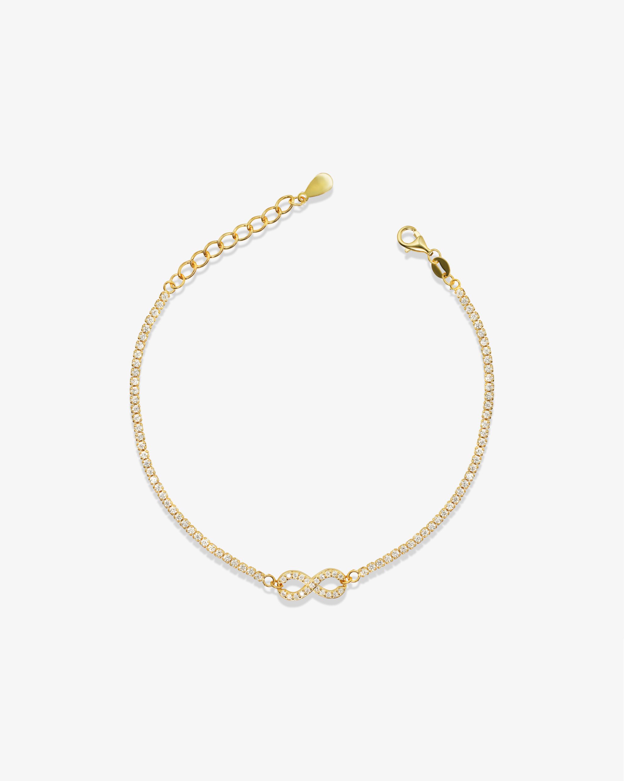 This beautiful bracelet is a must have for your jewelry collection. This beautiful bracelet comes in 18 karat gold platting and made from pure 925 silver, at the center sits a sparkling infinity symbol, representing timeless love and connection. Perfect for everyday wear or gifting.