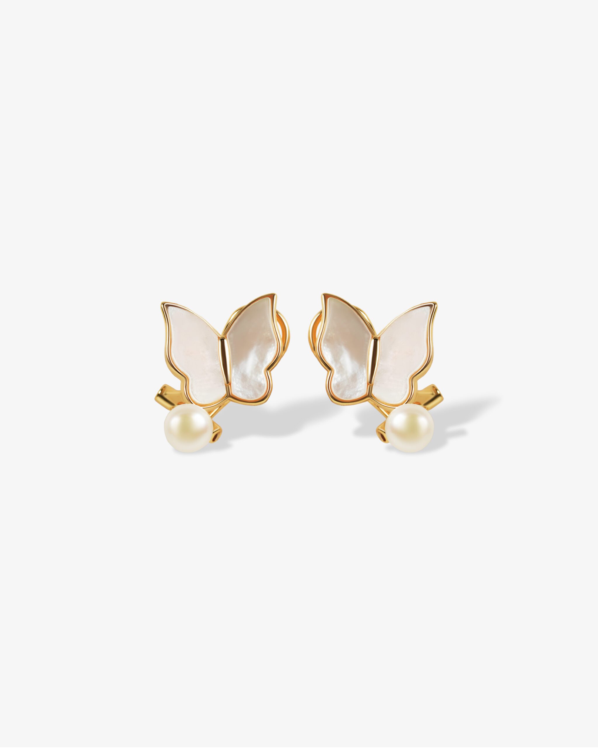 These delicate gold-plated silvert earrings feature a graceful butterfly design crafted from shimmering mother-of-pearl wings. A single luminous pearl sits at the base of each butterfly, adding a soft and elegant touch. Light, feminine, and beautifully detailed, these earrings are perfect for everyday wear or to add a hint of charm to special occasions.