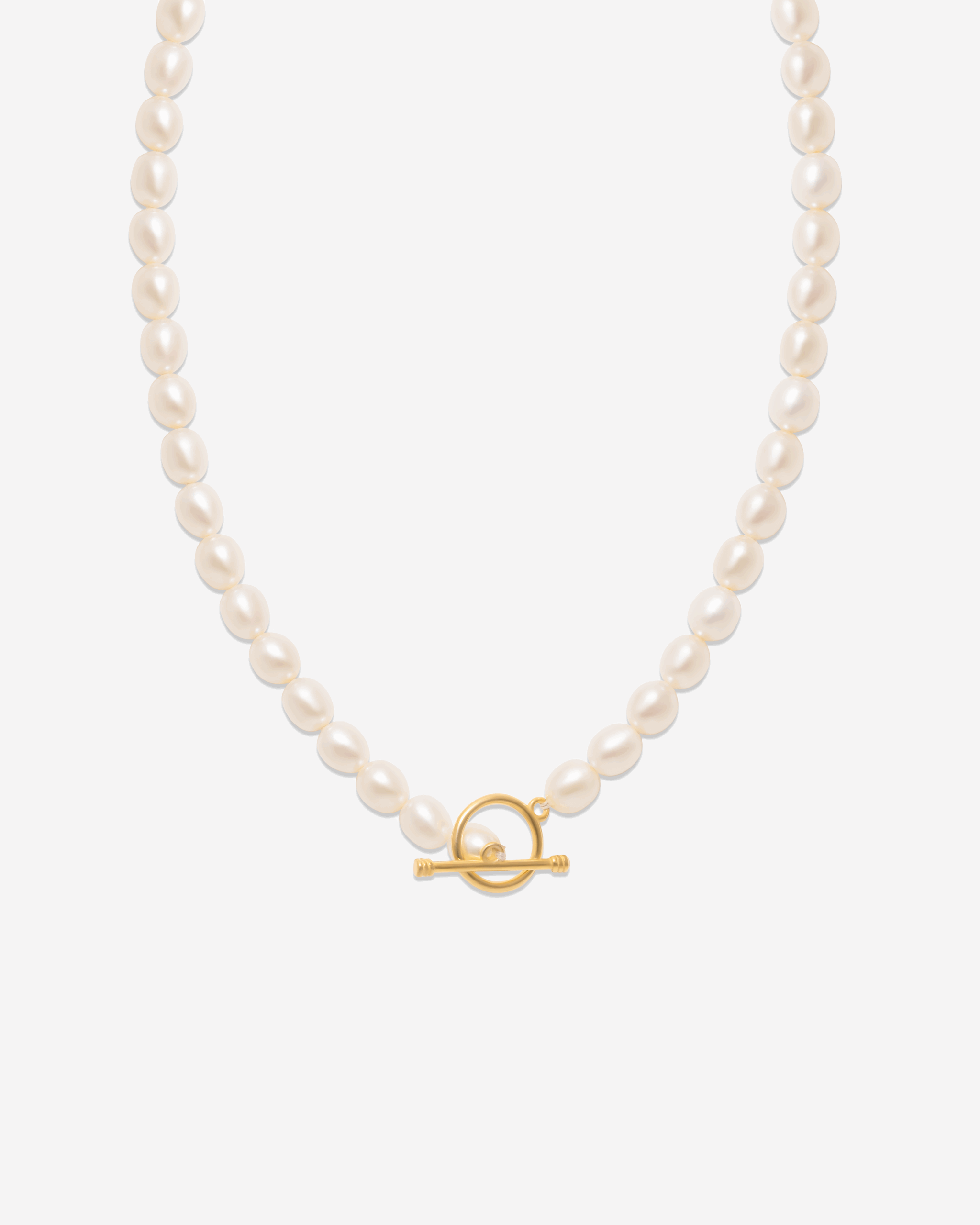 This beautiful pearl necklace is a must-have for your jewelry collection. Natural white lake pearls perfectly pierced into the most classic pearl necklace you could have, with beautiful 18 karat gold plated silver hoop-link in the center.