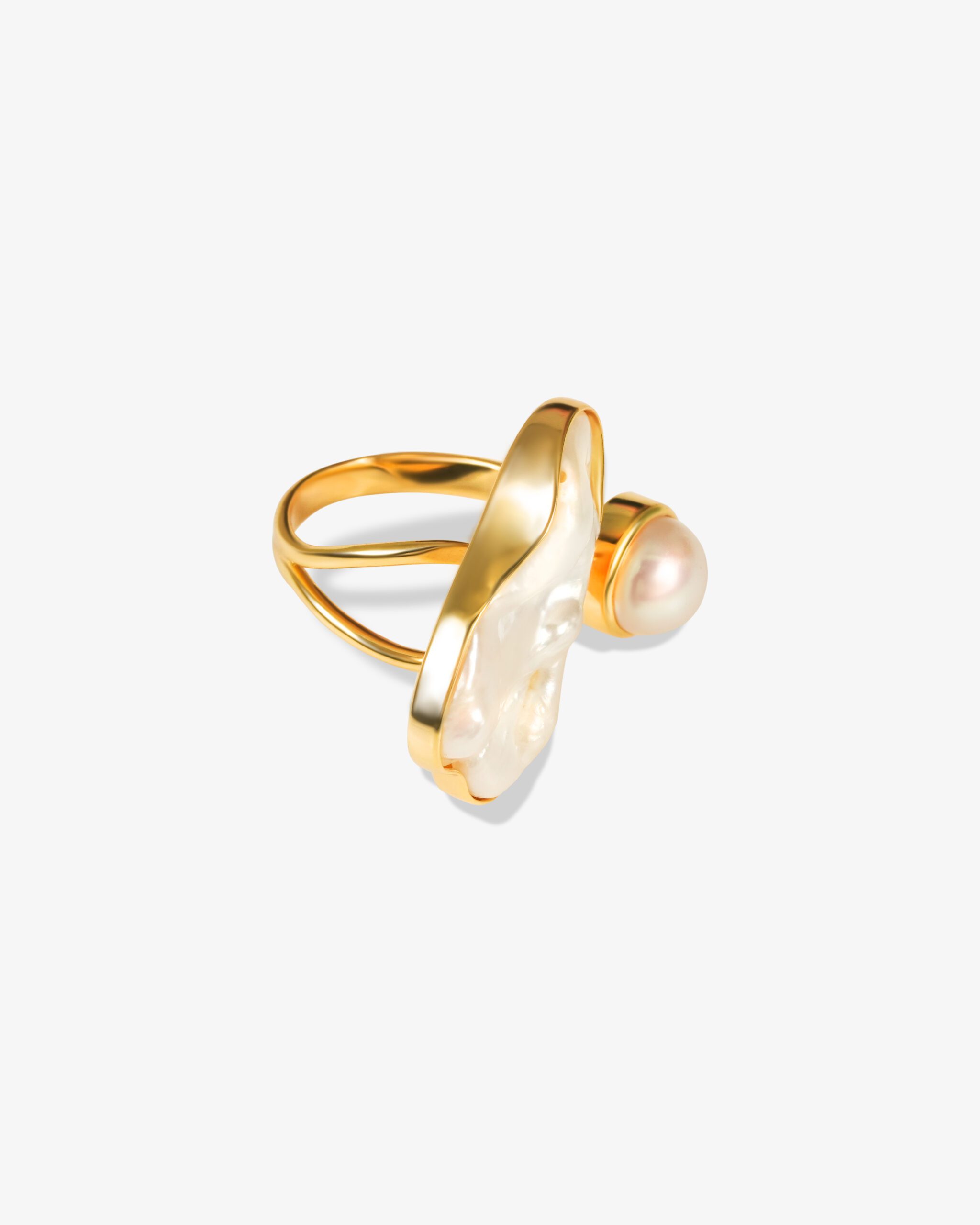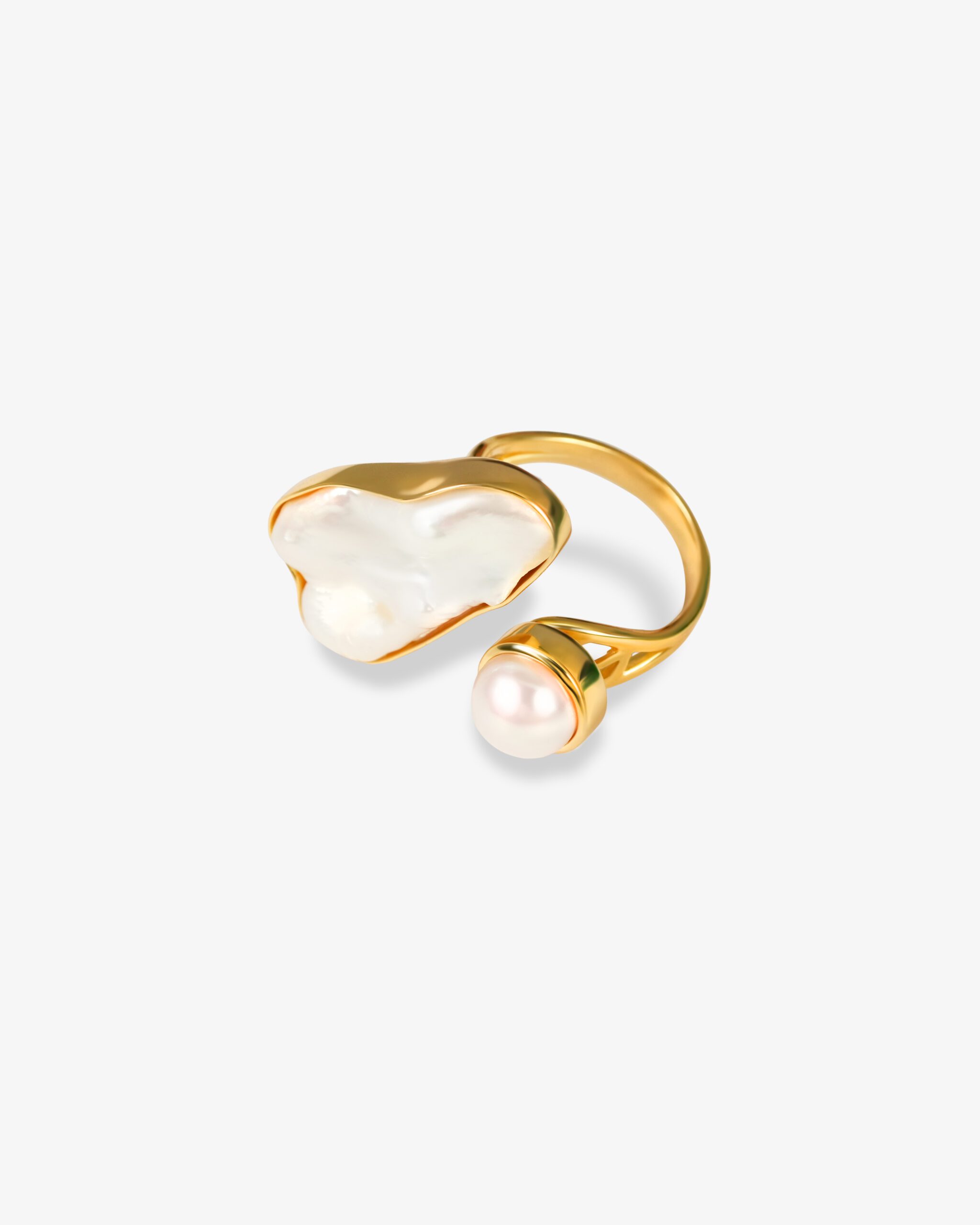 Artful and luxurious, this 18k gold-plated 925 silver open ring features a stunning combination of elegance. one side showcases a uniquely shaped mother of pearl piece with a natural iridescent sheen, while the other displays a smooth, luminous freshwater pearl. Together, they create a beautifully balanced design that feels modern, feminine, and effortlessly chic.
