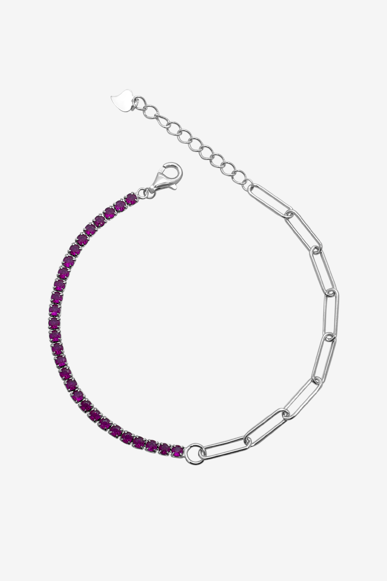 A tennis chain with a twist! Half tennis and half shackles bracelet design is a beautiful edition to any jewelry box. This eye catching item is made from pure 925 sterling silver and can be worn on its own or layered with other pieces of jewelry.
