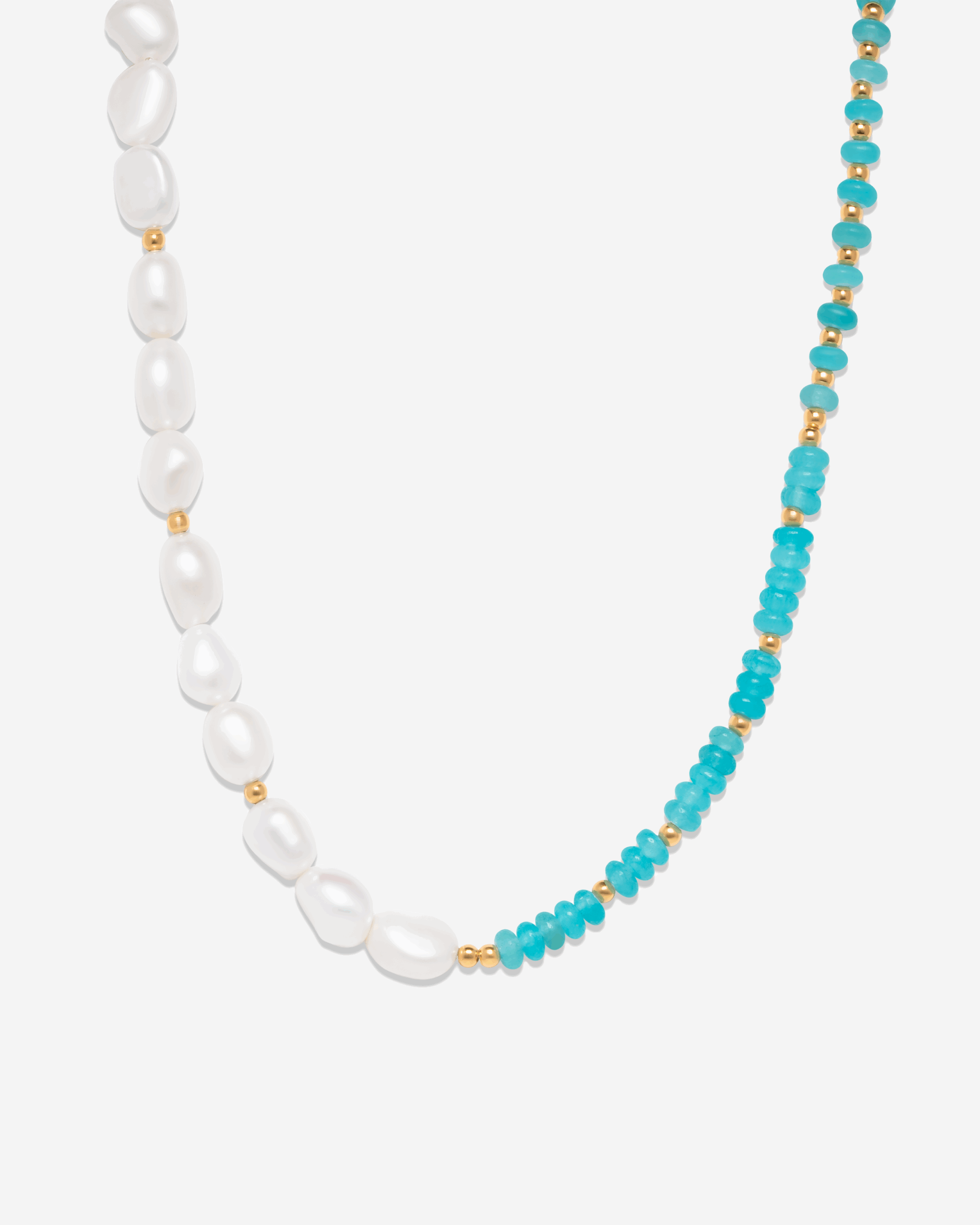 This beautiful pearl necklace is a must-have for your jewelry collection. Natural white lake pearls perfectly pierced into the most classic pearl necklace you could have, with beautiful 18 karat gold plated silver spheres across the pearls. This necklace features emerald green and turquoise beads on one half the necklace.