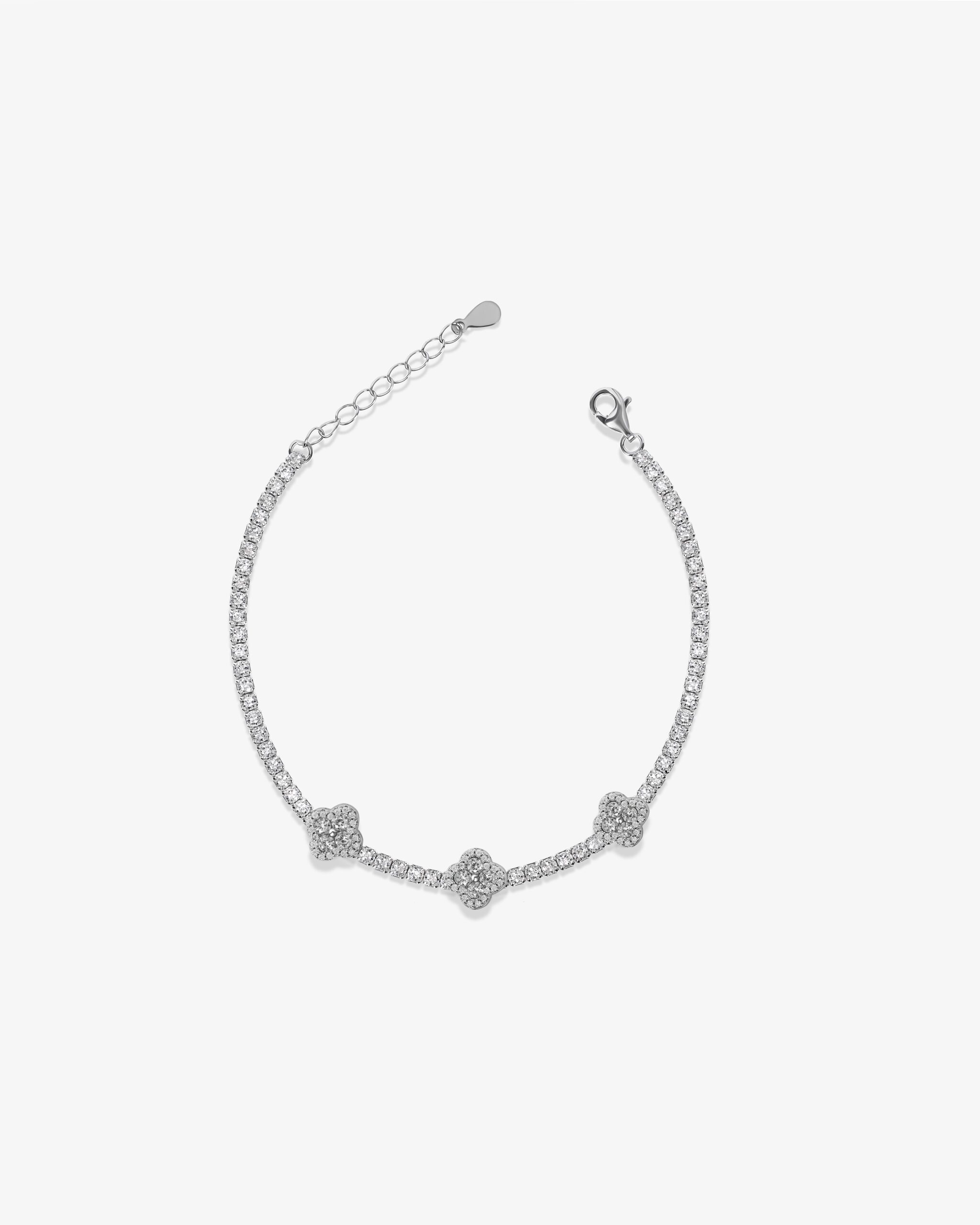 A sparkling silver tennis style bracelet featuring three crystal paved clover charms set along a line of shimmering. finished with a secure lobster clasp and adjustable extension chain. Elegant, timeless, and perfect for everyday wear or special occasions.
