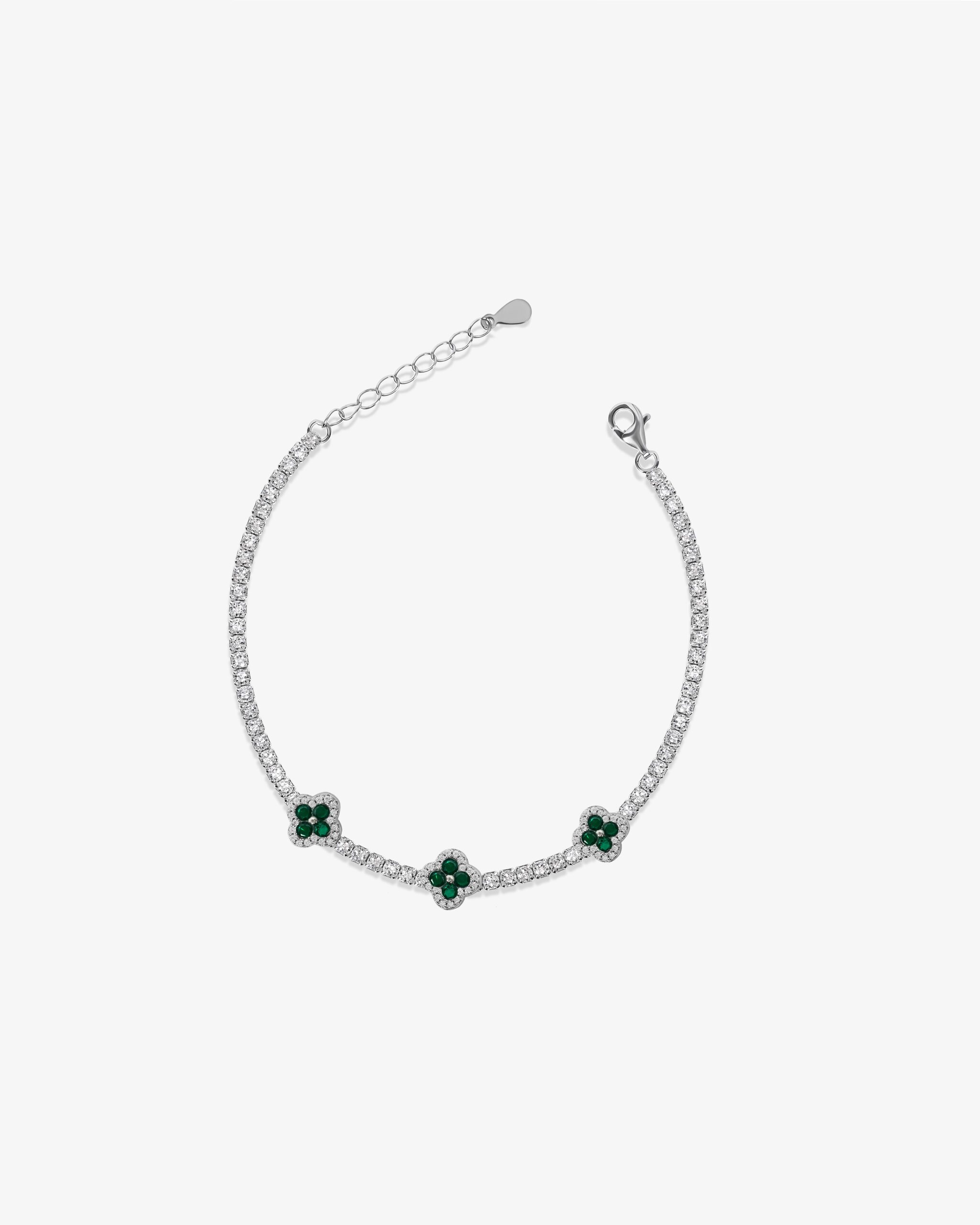 A refined silver bracelet featuring three green clover charms outlined with sparkling zirconia. Delicate, elegant, and perfect for everyday wear or special occasions.