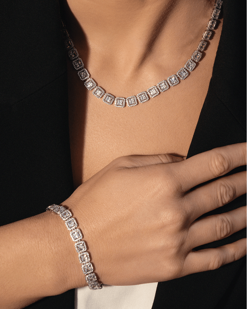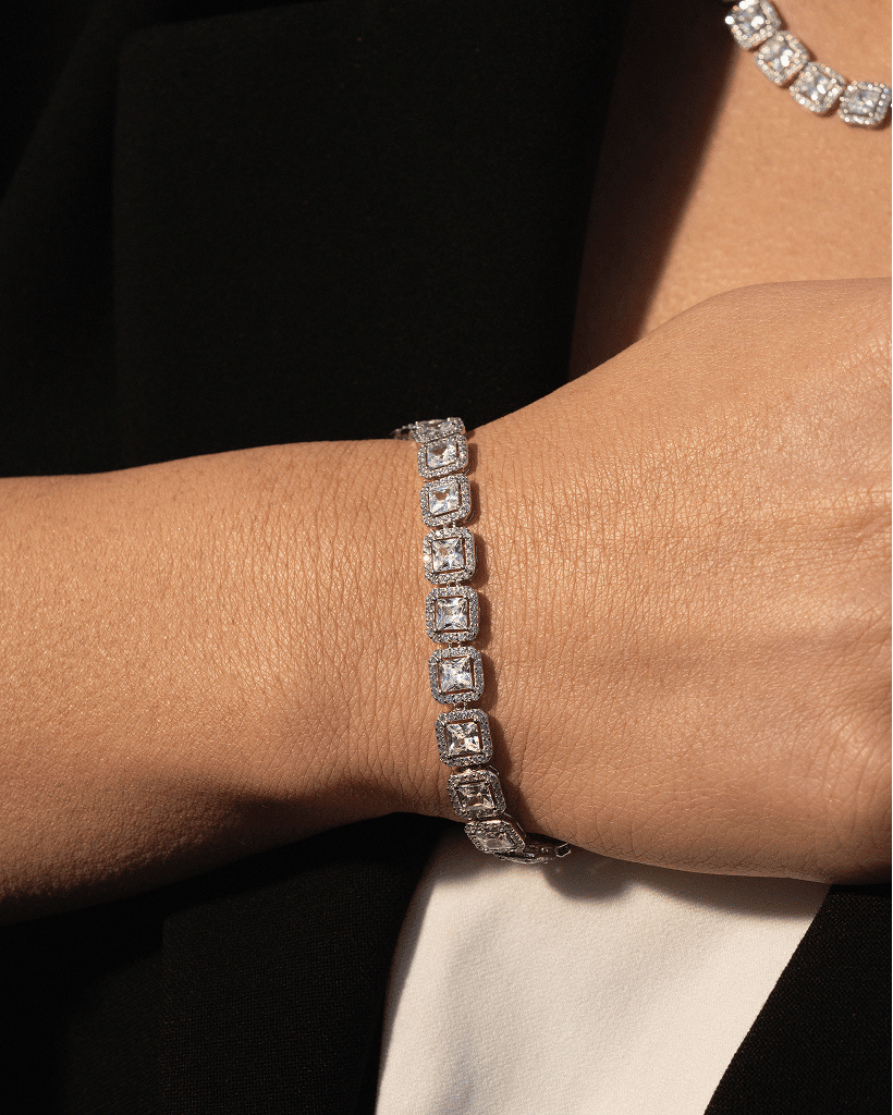 This exquisite 925 sterling silver bracelet features a luxurious row of large, brilliant white stones, each set in an elegant cushion style frame for maximum sparkle. It’s the perfect statement piece for special occasions or elevating everyday style.