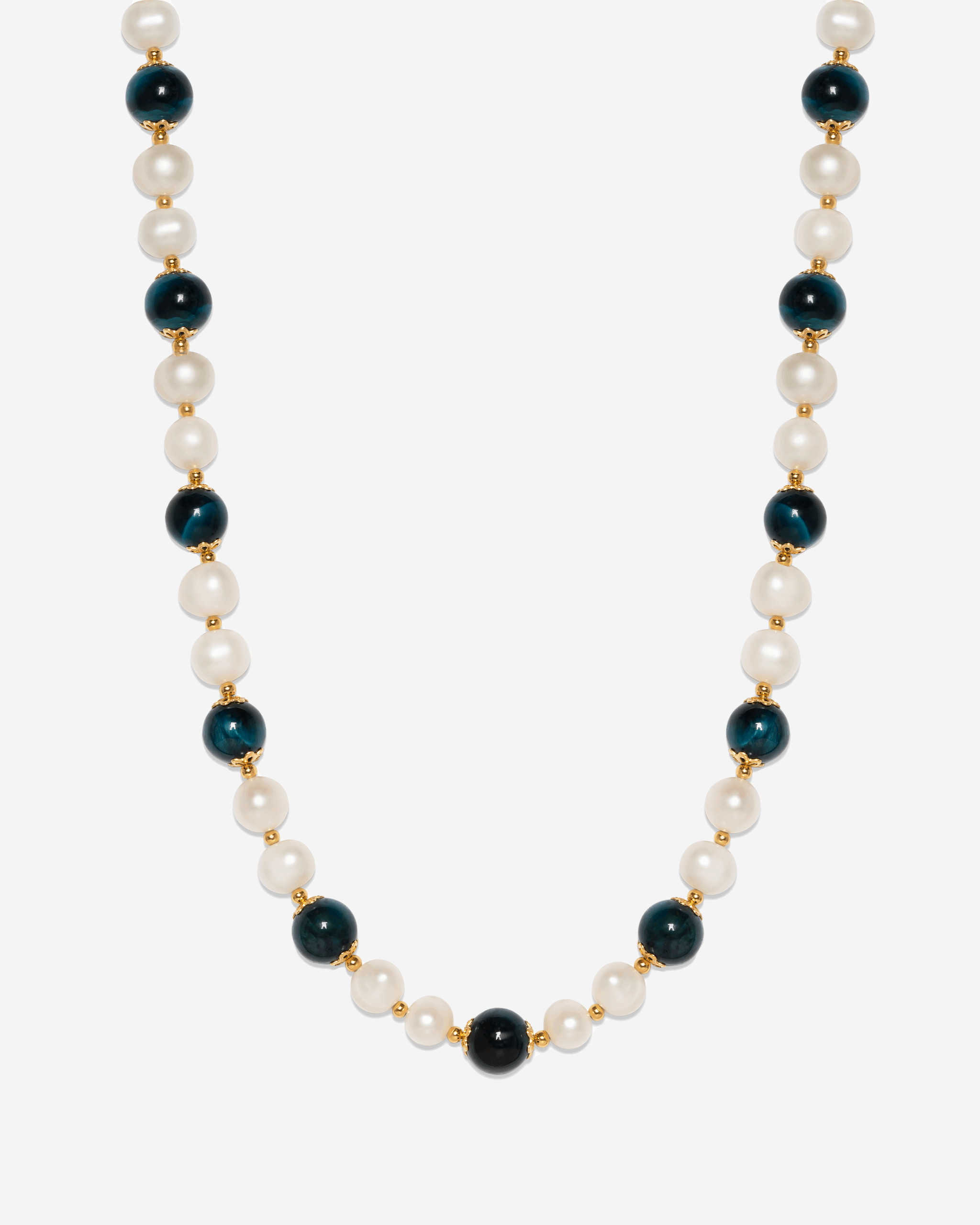 This beautiful classic world pearl necklace is a must-have for your jewelry collection. Natural white lake pearls perfectly pierced into the most classic pearl necklace you could have with a twist. These pearls feature a dark green/blue pearl in-between separated with sphere gold disco balls for that extra special effect. The perfect pearls for your jewelry collection, can be worn on their own or layered with other pieces of jewelry.