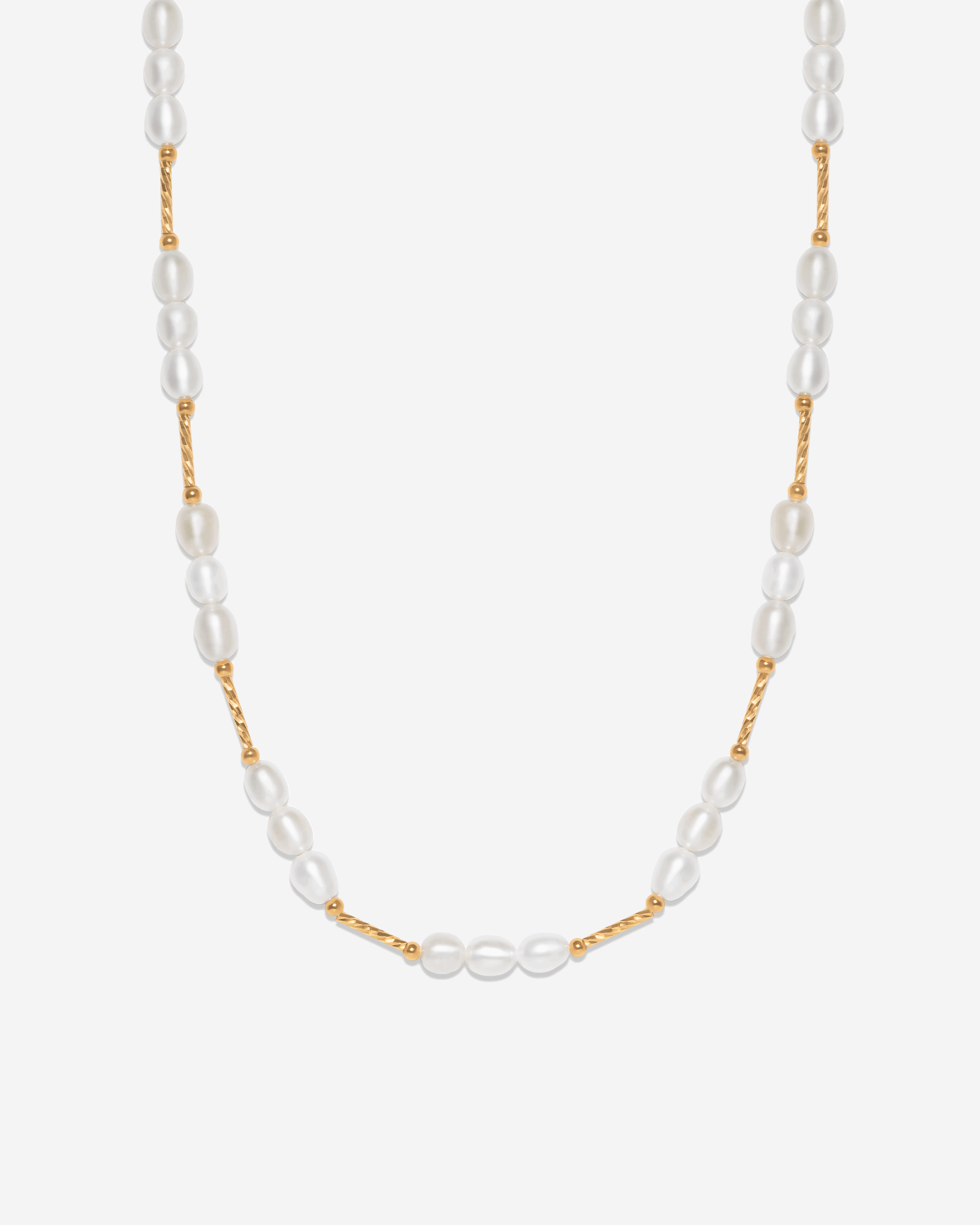 This beautiful pearl necklace is a must-have for your jewelry collection. Natural white lake pearls perfectly pierced into a range of classic shaped pearls, with beautiful 18 karat gold plated silver pieces for that extra effect.
