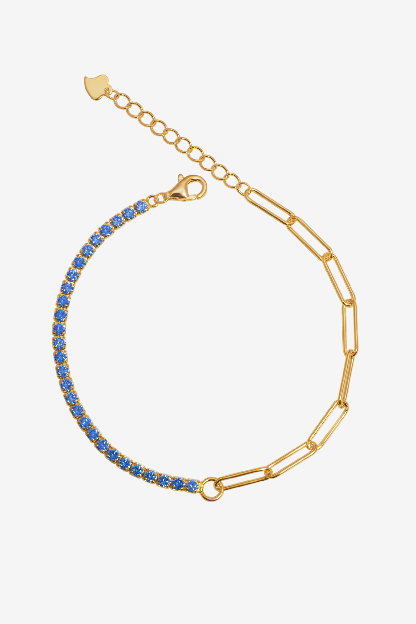 A tennis chain with a twist! Half tennis and half shackles bracelet design is a beautiful edition to any jewelry box. This eye catching item is made from 18K gold plated pure 925 sterling silver and can be worn on its own or layered with other pieces of jewelry.